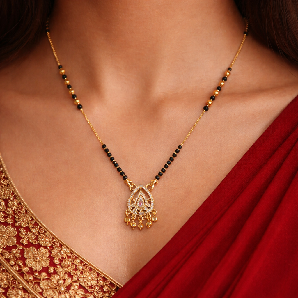 The sleek gold chain is accented with traditional black beads, leading to a finely detailed teardrop-shaped pendant. The pendant features intricate gold detailing with a sparkling central stone, finished with tiny dangling gold bead charms that add gentle movement and a graceful finish. Its lightweight yet ornate design makes it ideal for both daily wear and festive occasions.