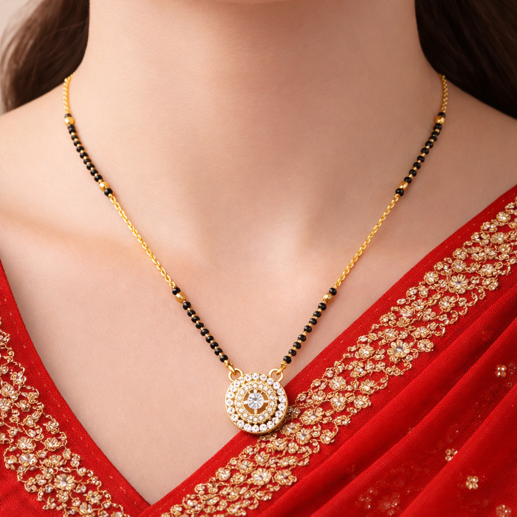 The design features a beautifully detailed round pendant with a layered diamond halo effect. At the center sits a brilliant stone, surrounded by concentric circles of sparkling micro-stones that create a rich, luxurious shine. The traditional black beads along the gold chain enhance its cultural charm, making it perfect for festive occasions, weddings, and celebrations.