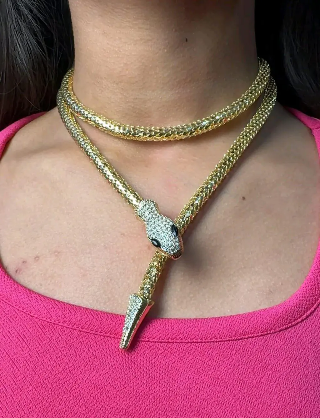 This stunning dual-layer snake necklace in radiant gold wraps around your neck with a bold, luxurious presence. The intricate serpent design gives the illusion of movement, creating a mesmerizing effect that commands attention. Whether youβre dressing up for a night out or elevating your everyday look, this piece is pure power and sophistication.